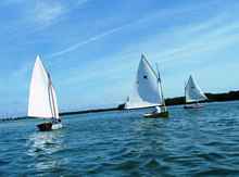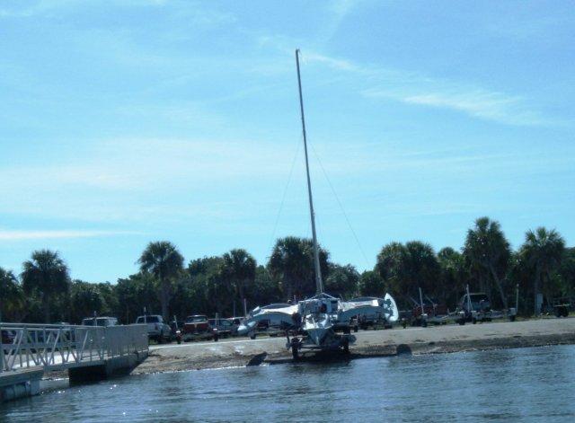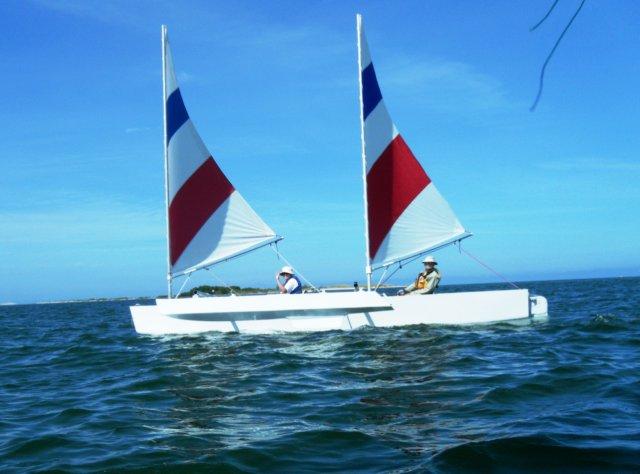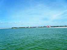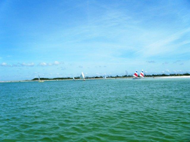| We had so much fun sailing at Ft DeSoto two weeks ago that we did it again and after hearing how great this place is some new boats came along. You can tell from these pictures why this area has been named one of the best beaches in the country. I'll comment on a couple of these; Franks big tri performed well but us mono guys still think it's just a skinny boat with training wheels. Michael had a new little boat he said was a skerry, I think. It was pretty but a little slow for him and it rolled him out into the water during a jibe and the big boat wakes.