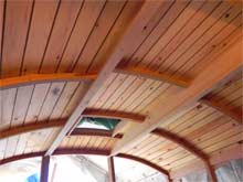 The curved roof framing gives the boat it's look, reduces the effect of wind and put the interior height where it's needed, the middle. |