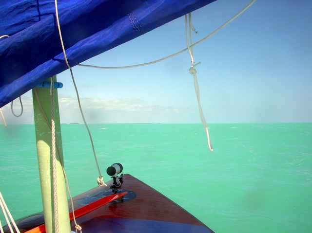 Chuck left me at the helm and I kept having one thought as the seas, freed from nearby keys and given some slightly deeper water, began to build. That was: "We've had a good run in the EC and had a spectacular run across Florida Bay, and now I'm going to dump the boat just as we scent the finish line." But it didn't happen. Walkabout continued to handle the following seas without fuss. A wave would come boiling past the boat and then began to whitecap just in front of the bow. At the same time, the next mound of cloudy emerald would catch the boat just right and shove it forward through the breaking wave in front. Sometimes it took some helm correction to go straight, but sometimes the helm would go light and the tiller would seem to vibrate, and the boat would hum as it shot forward over the next wave or two before losing momentum and settling back, waiting for the next boost. Exhilarating is too puny a word to describe the ride.