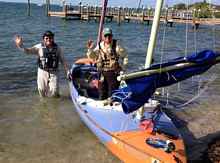 Finish: Two happy sailors at the finish line at the Bay Cove Motel in Key Largo after a sub-6-hour crossing of Florida Bay from Flamingo.