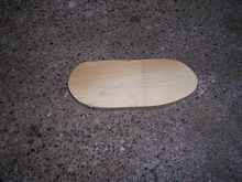 To start with, I needed a template (not to be confused with the word pattern that I use later for something else). This isn't going to be the final size of the patches, but somewhat smaller. I measured the largest area to be patched and cut a somewhat smaller template from some scrap plywood using a band-saw. I had decided that obviously irregular shaped was probably better than close to perfect, but not so perfect as to be reversible. I also figured sharp corners are likely to lift more than rounded ones, so I cut it free hand and ended up with an odd, faintly kidney shaped template.