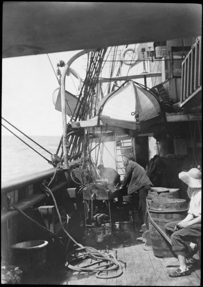 Not only did shipyards have blacksmiths, tall ships in the 17th, 18th, and 19th Centuries also had blacksmiths on board. The reason for this is that anchors were made in blacksmith shops, extended into the water using chain, which was also forged in blacksmith shops, which constantly needed repair. If you watch the movie "Master and Commander", starring Russell Crowe, you will witness an on-board blacksmith viewing the brain surgery done by the good doctor on board! I am also posting a picture of the blacksmith aboard the ship Scotia in its voyage from 1902-4, showing that particular blacksmith fashioning repairs aboard that ship.