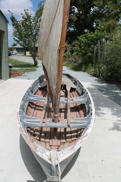 The 3rd boat we have just picked up she is 11ft 6inch sailing dinghy Known as the Stewart Island clinker taken from there 1960s we have not been able to confirm this yet she has a Kauri hull the Ribs are copper riveted shear down to riser then clenched to keel. The Knees stem Ribs and stern timbers all look like Kauri yet to be confirmed all Knees stem ex are natural crooks if Kauri she was built up North Auckland area sail is canvas all hand stitched with hemp bolt ropes main sheet is hemp spars are kauri appear to be young trees Knots and all just shaped up to fit??? Oars are a pair of very early factory made can not quite read the manufacturer but has Auckland on them.