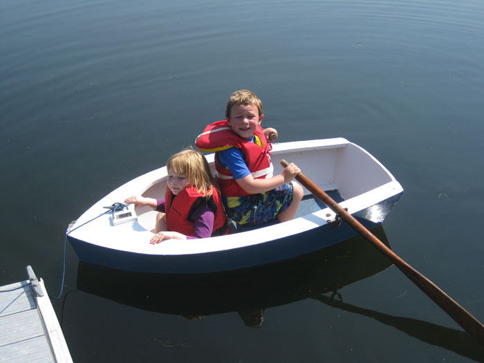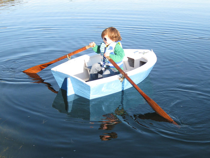 My dad built this boat over 50 years ago. He said the plans were from the plywood industry. I can't find them anywhere. The boat has a skeg running the full length so it tracks well. The T shaped seat is removable for when the boat is sailing. The "rig" was a 2"x3" with a sprit – no boom. Sail shape was similar to an Optimist, but the main sheet just attached to the clew. It didn't (or perhaps I didn't) sail very well. But a ton of kids have learned to row in this boat over the years. Although its only 5 feet long it weighs quite a bit, so when a child peers over the edge the boat heels, but doesn't flip or ship water.