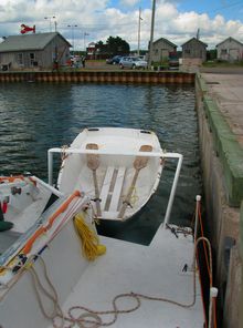 As I look back on the event, the biggest wonder is how the dinghy got missed to start with. I am 'sure' it was tied to the sailboat when the latter was being floated onto the trailer. I vaguely remember doing something about the dinghy so it wasn't dragged up by its rope when the sailboat was hauled up, but I don't have any certain recollection past that. The poor dinghy must have wandered around the harbour for about 2 weeks, driven by the winds and tide until it finally ran aground at a high tide and got locked in. It is amazing to think how well it stood up to all that pounding after it was locked in.
