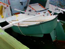 The strong West wind is now almost directly behind me and kicking up waves as it clears the sand spit. To reach the best landing place on the East side, I have to quarter the wind for a bit and then go straight downwind across the ferry channel to a landing place that can be reached by the truck. The tiny boat bobs over the waves without difficulty. The fetch was too short to build really large waves in the harbour. Rowing in big waves is actually fun if you are not at risk of being blown out to sea. Unlike with a large boat, a tiny dinghy bobs up over the waves and would only be at risk if a big wave broke just as it was passing. As I approach the landing I saw the truck zipping around to meet me. Loaded into the truck the dinghy is soon home where it belonged.