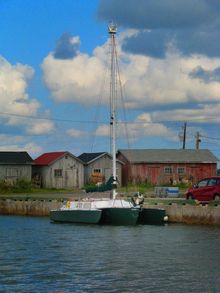 Note the dinghy in question is held up under a 2x4 glassed/epoxy-covered frame by blocks (pulleys) where it can be lowered just between the hulls for easy boarding. The shore scenes are of the sand spit (which actually connects to one of the islands of 'Wood Islands') where it was found buried in sand.