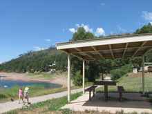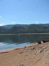 Last year we were able to launch from a little beach at a forest service day use area. That was a fairy tale experience. We had big tall trees there with lots of shade and our own picnic table for the time we were there. This year we saw that the lake level was way down but drove to the day use area to check it out anyway. We parked at the picnic table by the spot we launched from before and the water was about 100 yards out from the little beach this time. A puddle duck is not a heavy boat, but I was not going to haul it that far through all the mud and muck to get to the water. So we drove back to the marina and launched from the beach by the end of the boat ramp. We found a picnic table under a shelter not too far away from the boat ramp to eat our lunch at, but it was not nearly as nice as the spot we used in the day use area last year.
