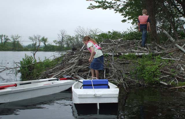 The kids explore the newest and biggest beaver lodge, the third one on the pond, the other two are now submerged. |