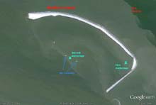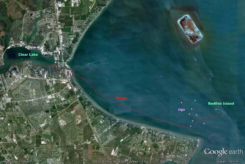 | I got a wild hare the other night, after a great day of sailing with the family, and decided I wanted to spend the night out at Redfish Island. This is a little man made arch of dredge material and cover rocks the Army Corps built to replace the "original" island that the tanker wakes destroyed years ago. Below are a Google Earth picture of Clear Lake and Redfish Island. For reference, it's about 9 miles from my marina to Redfish Island, and about 15 miles south to Galveston.
