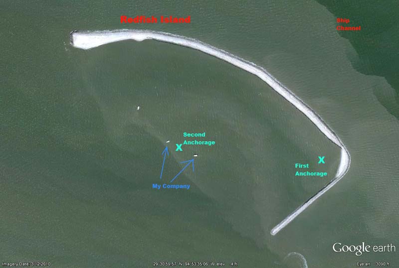 Here I am...it's pitch dark, I'm in a really light boat with tons of windage, surrounded on 3 sides with rocky shore, and rigs on the third (ok the rigs are a ways away)...to say the least I was worried! When I'm at home and need some information, I turn to Mr. Google. Being within cell range, I decided to use the same source of help! Google Earth is a source we often use while planning, but having looked at Redfish Island on GE many times, I knew one thing: The picture on GE shows several boats anchored..and I wanted some company! My plan was simple, anchor where they were anchored when the picture was taken. After recovering the anchor I motored about 150 yards north west to where the 2 biggest boats were, and again set the anchor. Now at least I wasn't alone (at least not on my phone's screen ;-)