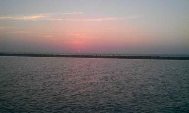 Twilight broke beautifully over the East Bay, and all the scary sounds and the menacing black island were chased away by its dim orange glow.