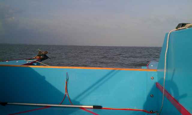 Once past the rigs I had open water; another 30 minutes and I would be there. I was now out of the protection of Eagle Point, and parallel to an increasing south wind. With the very long fetch I was exposed to large bay chop and the ride was a bit rough. Being on a big cat it wasn't really an issue. I trimmed sail for a nice reach (which is an interesting trim scheme on a biplane rig) and sat back for the ride.