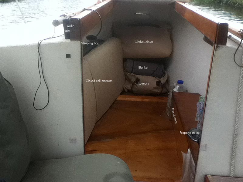 For 3.5 months I slept every night in the boats’ cabin. This was no hardship as my closed cell mattress is as comfortable as any bed. Also, I always anchored out, or tied off to an overhanging tree branch, gaining privacy and saving marina docking fees which can be considerable. Spain’s Costa Brava has plenty of harbors but almost no anchorages, and those are just open roadsteads, so I did tie up one night at a marina slip. It was a weekend, and there were parties in progress at every other slip. The din finally died down about two in the morning, but I was reminded once again why I hate docking at marinas.