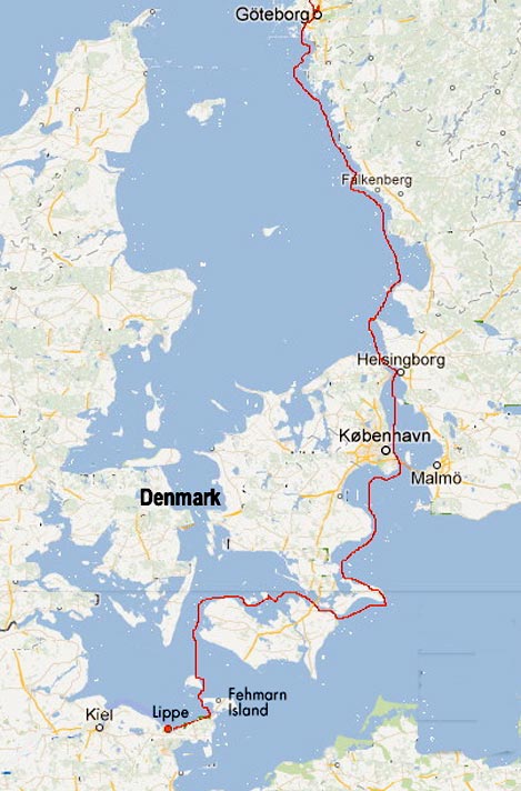 After too many days of extremely adverse conditions, 4am this morning saw a flag pole with an all but limp flag off in the distance at Vordingborg. 12 hours later, after making my longest ocean crossing yet - forty miles - I say goodbye and thanks Denmark, and hello Germany.