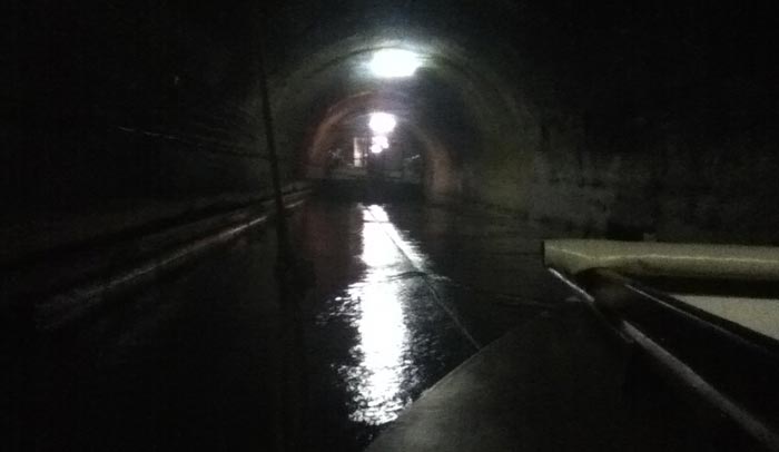 The tunnel is about 3 miles long and to traverse it you have to hook up to an electric tow boat that pulls you and a caravan of boats through the tunnel. However, I’m the only one here when the tow shows up so it’s this big tow boat with its huge hawser towing just me along. The tunnel is not very big but plenty big enough for KOTWolf and it’s fairly well lit though there’s nothing to see.
