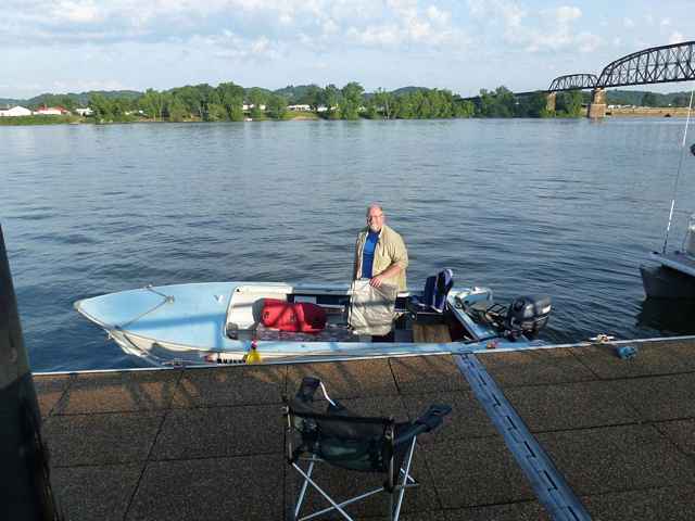 Reaching the confluence of the Kanawha and Ohio it is exciting to boat into/onto the larger Ohio (1500 feet wide vs. 750 feet wide) and head upstream the short distance to the Point Pleasant levy. The concrete levy and public floating dock is a welcoming place to rest for the night. Ominous black clouds and lightening had filled the western sky as we arrived. The boats were made fast and we rapidly walked the few blocks through town to McDonalds to eat a fast food dinner and watch the rain, lightening and wind go during fast moving storm as darkness fell. After filling up on not so healthy options we enjoyed the walk back to the levy with cooler temps and a wet ground after the storm. The boats rode out the brief storm no worse for the wear and we proceeded to bed down for the night. Steve, in the RIB, had just enough space for him and his gear, looking like a bug snug in a rug.