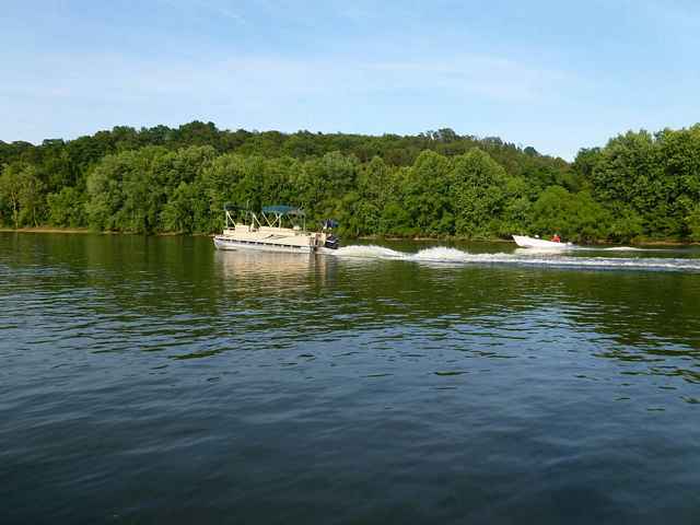 The river is marked by mileposts which start from the river's junction with the Ohio and travel up stream. The markers and associated lights are good waypoints and are really handy when navigating at night. The Kanawha is a commercial river so passing the occasional tug and barge string can be intimidating as these tugs are often 2600 hp and pushing strings of barges upwards 1000 foot long and two to three barge widths wide. Fortunately, the river is wide and a small boat takes little room. Surprisingly, the wake from the tugs is not as strong as one would suppose and is well tolerated.