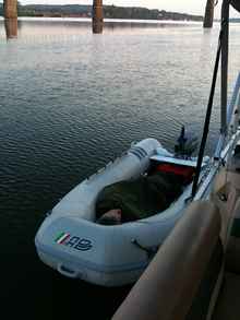 Boat 11 foot RIB, modified for open boat camping cruising with removable center seat, dual 6 gallon fuel tanks, rigid fiberglass floor, floor, propped for efficiency with a high pitch prop on a 15hp Johnson 2 stroke.