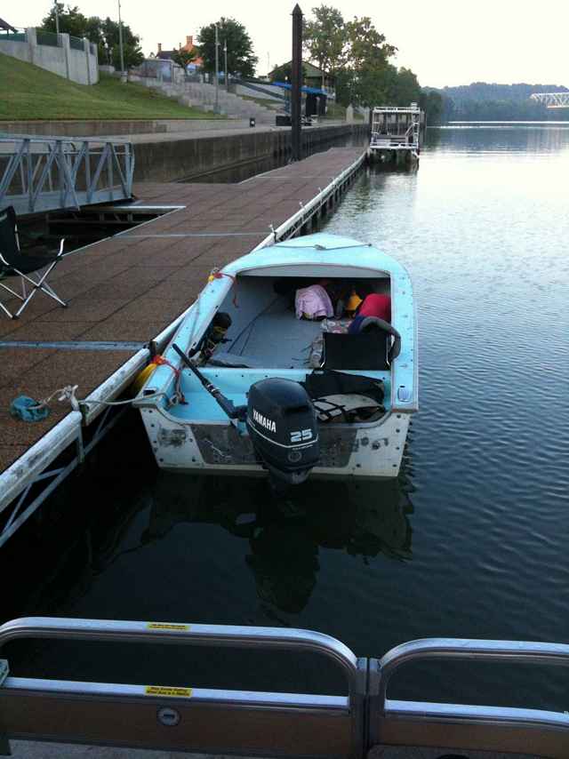 I started with an abandoned 1965 "Jet" aluminum hull, modified with a flat wood floor/deck, tiller steering using Yamaha 25 hp outboard, homemade "free" fender, tiller extension, and motor tilt lever and camping tarp.