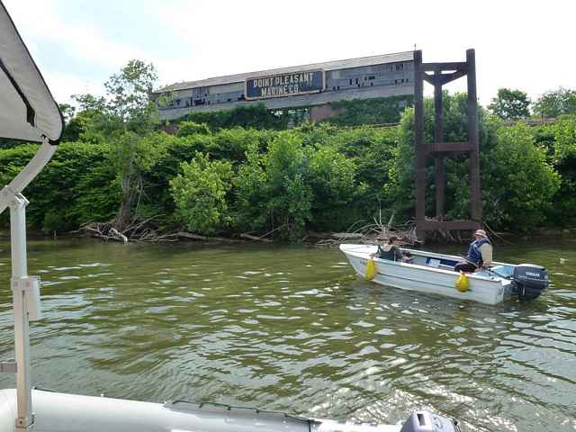 The old hotel has been through several floods with the first floor submerged in 1913 and 1937. Supposedly haunted with the souls of lost patrons, we only visited for a brief time finding no spirits to linger with us. Having a bit of extra time in our schedule we decided to boat a mile upstream and visit the now defunct Point Pleasant Marine Company. The old pilings, dock and river front building give interesting photo opportunities.