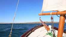 Wind blown white caps and waves In contrast, after arriving back in Southern California, I took my 80 year old dad out for a sail in Alamitos Bay. No wave action but a solid consistent 12 mph wind. What a great sail we had on all points. Gybing was fun, and we embarrassed the skipper of a West Wight Potter on a reach back to the dock. His trim looked perfect for the conditions but we passed him like he was standing still. I know the Potter is a slow boat but it was the first similarly sized boat (15 ft) I have been in contact with to compare boat speeds. Usually, I am up against 20 ft keel boats that have out pointed me upwind, while I seem to almost hold my own running with them on a broad reach. Another boat we ran into was a 18 ft racing dingy with Spinnaker and planing hull that was practicing a typical course race with a single skipper on board. I was impressed on how quickly he was able to set his spinnaker and round the marks. She clearly was quicker then Alice Gale overall, but I was still impressed with how well Alice Gale did. The speed difference was not immediately noticeable and I was able with concentration to maintain comparable speeds on several tacks with him. Not bad for a Balanced Lug.