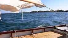 The sweet spot for Alice Gale appears to be winds between 8 and 12 mph. She is extremely comfortable with these winds speeds and sails wonderfully at I believe to be her hull speed. We are able to tie in a "Cajun tiller tamer" and broad reach with a glass of wine and good conversation while taking in the sites. Under these conditions Alice Gale has exceeded all the expectations I had hoped for when I selected her plans. We have learned from this trip that trailer sailing vacations are fun and very rewarding.