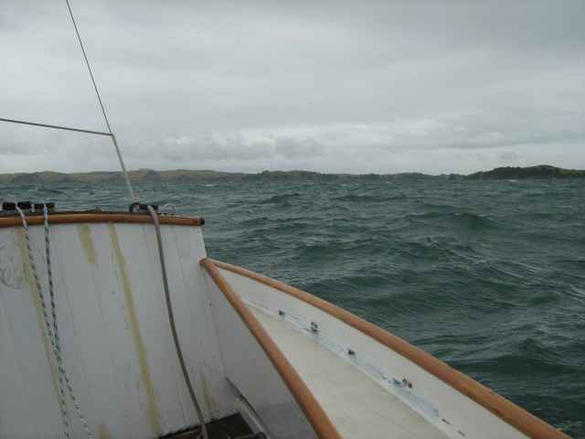 I was still asleep below when the wind changed at about 4 30 pm, the change in the way the boat was moving to the waves waking me from a light but refreshing nap. Although a couple of hours out the forecast sou/westerly change had arrived sending a swell into the bay, so it was a quick bite to eat, up sails, up anchor, clip the harness to the jackline and we, Spook, Offcuts and I, were off around the point and running hard for Mahurangi some 15 miles away.