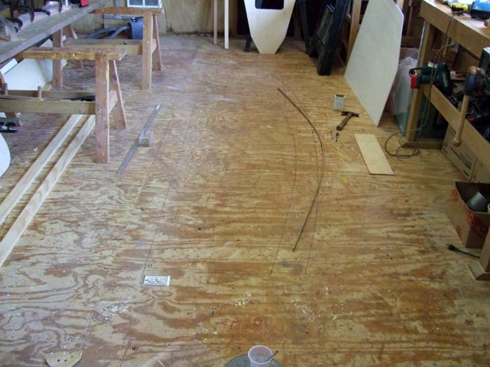 At this point I had studied the plans sufficiently to get started on the real work of building the boat. The beginning step was to get the table of offsets turned into real frame/station shapes. This was accomplished by drawing these full sized on poster board. I think it is very informative to get a look at the shapes of the frames to get a better feel for what the boat should look like. I will stress that this process should be done as accurately as possible as the entire boat shape will be determined by these simple lines. Take your time and double check every measurement.
