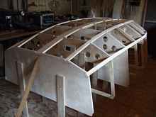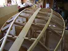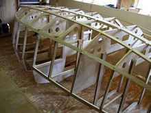 With all the frames completed, the time had come to place them in a way that would allow the boat to be built. The floor was accurately marked first with a center line and then with station locations that were shown on the plans perpendicular to the center line. The frames were then supported in an inverted position by temporary supports that were securely anchored to the floor. The height above the floor would reference the waterline mark on each individual frame. The overall height above the floor was determined so that the entire structure was at a good working height and enough space was allowed so that I could crawl under the structure during construction for additional work during planking.