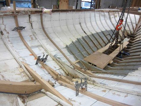 New steam bent oak ribs installed in the Herreshoff 12.5