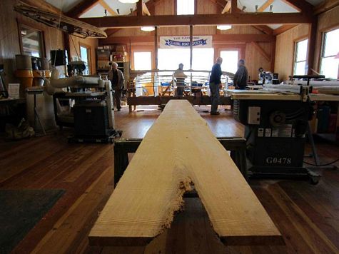 What is 21' long, 23" wide and has no knots? The above Atlantic white cedar plank inside the Community Boat Shop with the skeletal frame of the Goeller dinghy 2013 raffle boat visible in the background.
