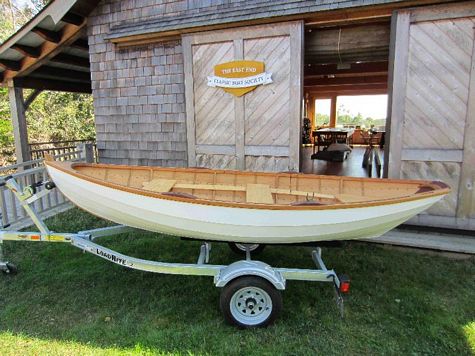 Profile 12' length, 4' 3" beam, white oak framing, Atlantic white cedar planks, oak transom, sassafras seats, copper rivets, silicon bronze screws and bolts, rig - single sliding gunter, propulsion - oars, sail and capable of taking an outboard. Will come with new Load Rite galvanized trailer.