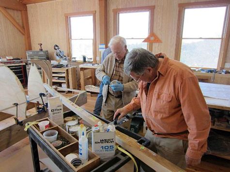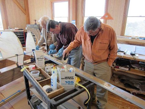 Epoxy being applied to the keelson of the 2013 raffle boat Goeller Dinghy by volunteer members (right to left) Burt Van Deusen, Bill Hoppe and Ray Hartjen, president of the East End Classic Boat Society.