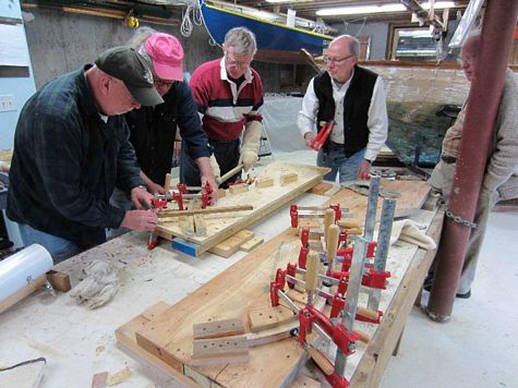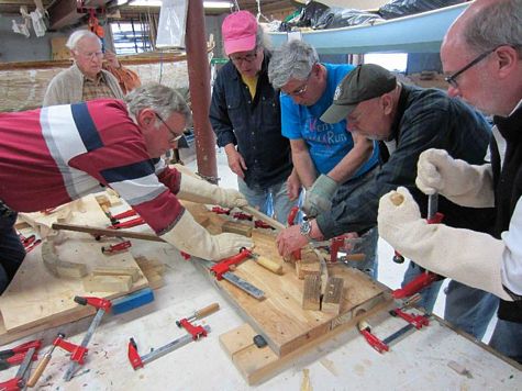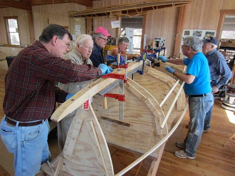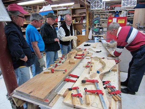 Oak rib being placed into predesigned rig by Pierce Hance and fastened into place with clamps by (right to left) Ron Ahlers, Rich Kelsey, Richie Davgin and Nick Stephens while Ray Hartjen observes.