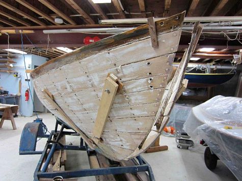 Bow braces on Herreshoff 12.5 to maintain the proper shape of the hull for the installation of a new bow stem. Built in 1921 and donated to the Classic Boat Society by the late Mark T. Hughes, who lived in Shelter Island Heights, N. Y.