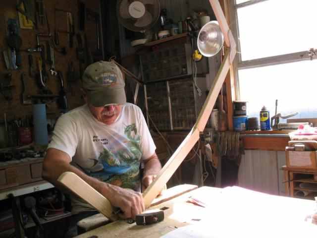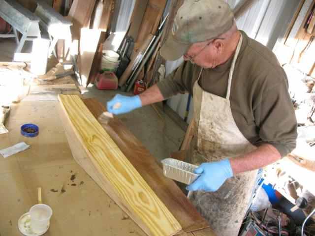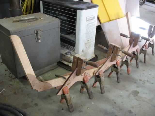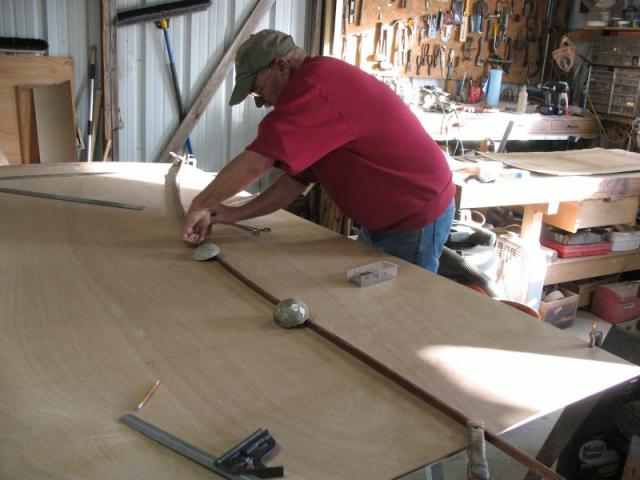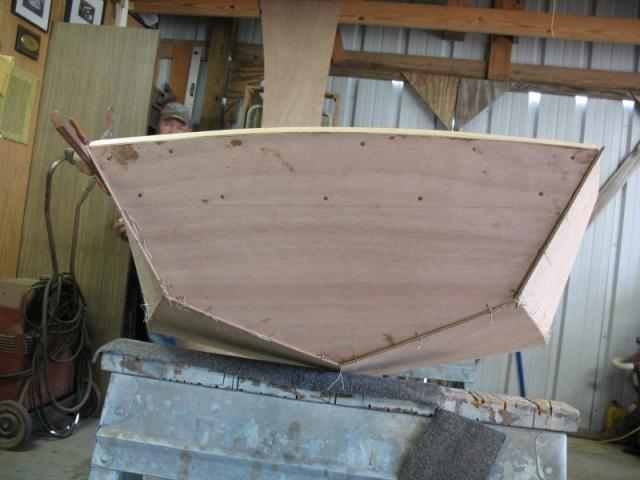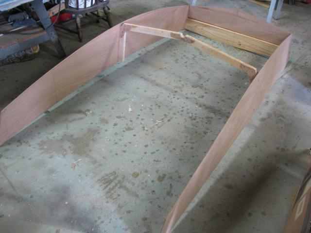 The boat gets a center frame of solid wood, with corner gussets and all those knees get glued together.