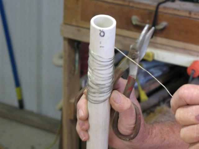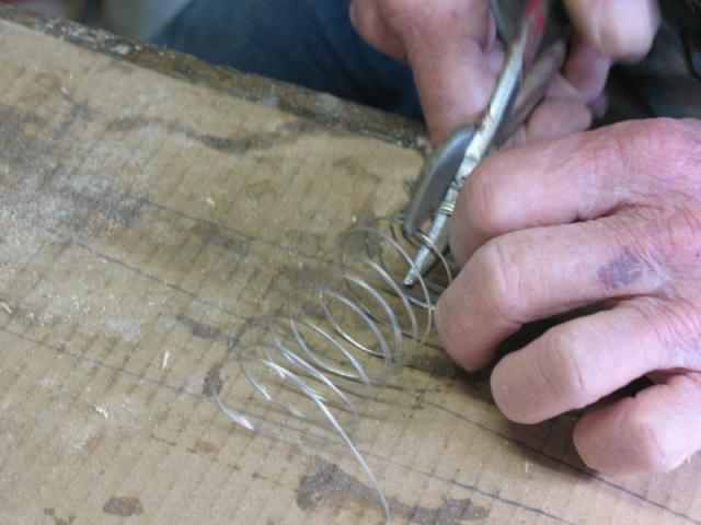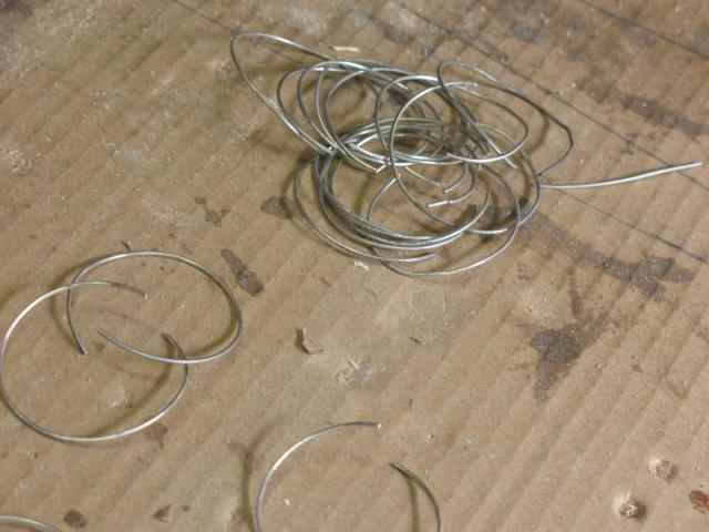 We're gonna wire the boat together, so we need many short pieces of wire. The simplest way to get them is to wrap them around a 1" rod many times, slide the coil off, cut along one side, and end up with a bunch of rings.