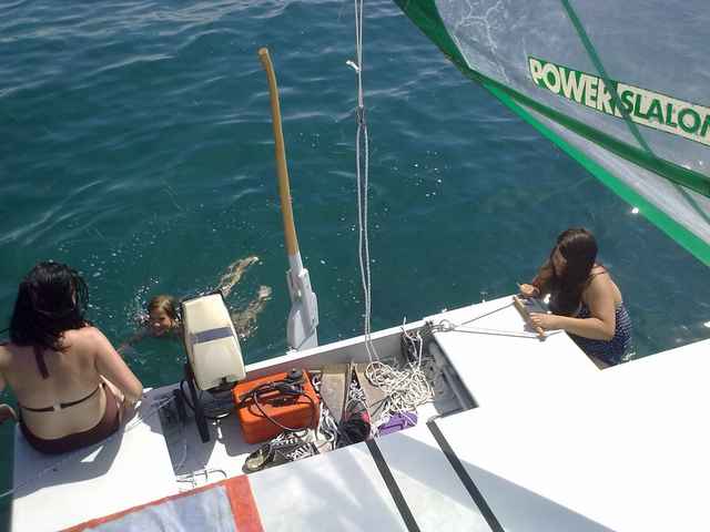 All in all, I like this cat. It is better than I expected, especially loaded - even overloaded beyond specifications. It is a perfect young-family vacations boat, you can tow it with car, 4 people can put it in the water, you can live for a few days on it. With this big cabin-top terrace you have far more places to enjoy the water than in a 20' sailer. It is under 5m class - this means no taxes (in SLO) and a lot less expenses for registration, insurance and even marina costs. Marina in Koper (SLO) costs me 24e per day - with electricity, water, WC, bath, usage of work-shop. Half cheaper than the usual camping fees on the seaside with much more support. Surprising for me is how much money I wasted in all those years for coastal vacations.