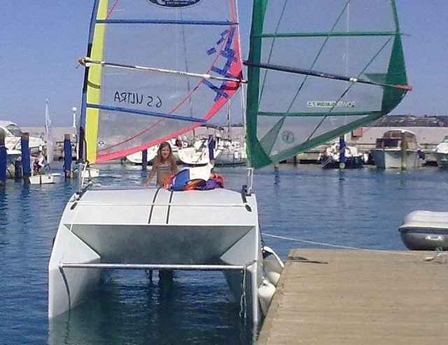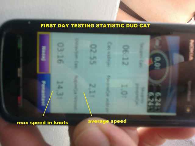 About speed - 14.3kt was not achieved with exactly the same sails from the picture - I sailed with green 7.5m2 sail and another one 8.5m2. This big sail got many serious long fractures in monofilm after the wind refuls which gave me few seconds of top speed. After that I sailed 5-6 average. It was first sailing with only 2 of us - 170kg together, 15kg outboard with gasoline and 5kg anchor. Maybe 2 kilos of life jackets. We jumped trough and over 1-1.5m waves wondering when the boat will fall apart. The sound of front beam when wave splash into it at this speed is a bit scary for first-timers. The water noise behind the stern become louder, then comes a loud flopping sound when wind hits the sails, the rudder becomes harder, you don't know what to do with the sails and you are just in the enterance of Koper port with a big container ship coming out directly at you and you don't know how to turn the little cat away. There is no time to turn on the outboard. At one moment you are going backward, next moment you nearly fall into the see when another flop in sails comes and boat the accelerates. Some kind of knowledge comes from deep dark hole in the brain. Now I know enough to get back to marina, with sails, of course. Forget that you have to motor with 2kt max. I know how to avoid boats in just a few meter corridor with 3 turns when the outboard don't want to start. There are a bunch of people at the restaurant watching your space-ship like boat coming thinking you are first class transatlantic skipper but you are just trying to hit the cheaper boat. At the moment you think that the cat knows how to port by itself, like a cowboys horse. It did know! Ok, release sails, fasten fenders, look at the GPS and when you see number - oh boy - you have to go in the bar and drink a beer smiling. After that I put on a smaller, 6.5m2 sail - 8.5 was destroyed. In the next days wind was very light and max speed was 9kt, average only 2kt. But we were learning how to handle this starship.