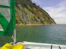 Unfortunately, except for one day, I had very low wind - 3-5 m/s, with occasionally some stronger refules. One of these refules on my first day, when I didn't know how to sail parallel, gave me some kicks and I later saw on GPS that the max speed was 14.2 kt! I remember I did hear some more noisy water behind the stern, but there was 1-1.5m waves and I was too busy with 2 sails and the rudder to observe the speed. I was a bit shocked