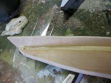 Now I also made a wooden model of the cheap canoe. I based this on the carton board model. I only made the bottom and one side and glued them together using the duck-tape and glue method as you can see in the pictures. Instead of using epoxy glue however, I just glued the joint with polyurethanes (brand: “Bison” as readily available here in the Netherlands, here this is known as “construction glue”, especially intended for outside constructions). Disadvantage of this glue is that expands (with some force) and that the taping needs to be done really good or the joint will expand L. Upside of this glue (for me) is that it needs no mixing, is cheaper (I think) and does not have the toxic sensitivity issues associated with epoxy. Result is a joint that is indeed strong too. Not sure what I will use in the actual boat though. I the past I already glue two pieces of waterproof 4mm plywood together with this glue and had it submerged in a tin of water for 1 week: still a very strong glue composition: no difference with before the submergence.