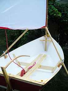 It did not take long to get busy on the boat and started to work out the details. I wanted this to be a sailer as well, although there were no plans for that. After reading Jim Michalak's newsletters and articles, it seem fairly straight forward to calculate the center of effort and the size of the center board. Eventually, I built both boats, and yes, they both were awesome sailors. The first boat I built with a center board and I have that dinghy even today. Originally I built an optimist sail for it and even today I use that, although, since then I took the sail apart and put some more broadseams in there. The first rudder on the boat was a traditional rudder, however the boat is too narrow to sit on the side to steer, so I converted that to a push/pull rod rudder, like the ones are common on canoes. It is a lot more comfortable position to face forward and steer and sail like that. The plans called for a longitudinal seat which works excellent for fishing and rowing, however when sailing, the boat heels and therefore one tends to counter balance the heeling of the boat. At this point it was obvious that the center longitudinal seat was not a good option for sailing - so I removed it. At first I wanted to build another seat in there, but it turns out that the boat is a lot more stable and comfortable when sitting on a cushion on the floor, and on the plus side, now the boat is even more spacious. To make even more room, I removed the middle frame cross beam, which is about 4" above the floor effectively dividing the boat into two halves, and layed it on the floor adding new braces for the vertical frames. This worked out very well too providing more space.