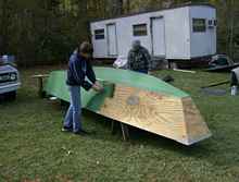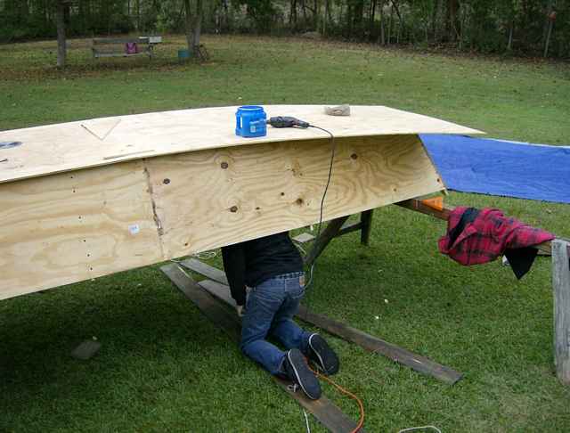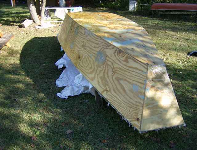 Several days of wet weather and dropping temperatures delayed the build, I could have used another week of time to take care of some of the "details", but as I told one observer this is a "Chevy", not a "Cadillac". The fiberglass, Polyester resin, and Angel Hair Filler was the most expensive part of the build. The entire exterior was glassed with 10 oz cloth, the interior seams were sealed / glued / filleted with angel hair "bondo" covered with a layer of 10 oz cloth and 3/4 oz mat.
