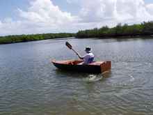 This boat is a little long at 13 feet for a short bed pickup and its 30 inch width is a little hard on 70 year old bones getting in and out. But what if you short end the length to 9 feet and spread the width to 36 inches and used a 9 foot double paddle. You end up with a boat that resembles the builder, shorter and fatter, thus the name SHOFAT. I still love to torture plywood so I twisted a 9 foot by 3 foot piece of Luan plywood into a hull bottom and added 12 inch sides sculpted to a narrow front bow.