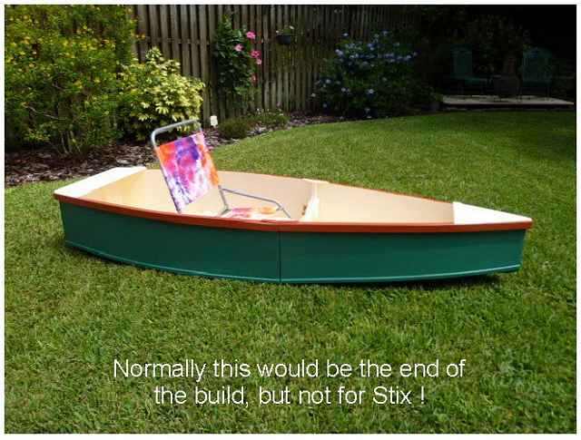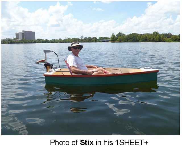 Anyway, I sent him a couple of plans that interested him, one being the Mini-Cat, the winner of the 2012 Design Contest. Fast forward about 6 months, and I get another email asking about the optional canopy shown on the plans for the Mini-Cat, and I informed him the it had not been constructed, and it was just a concept. As a matter of fact, no Mini-Cat had been built at that time. Now his interest suddenly changed to the 1SHEET+ design, which was the other plan I had sent him. I tend to send plans to people who show a sincere interest in my designs, and who have something to offer in improving the portable boat concept. Another lapse in time and another question; Can a thinned Titebond 3 glue be used as a waterproofer for sealing a plywood boat. A man after my own heart, I tell you. And of course it can, as I do it all the time, especially in areas that are to be enclosed, and not visible. So with this information in hand, Stix began construction of the 1SHEET+.