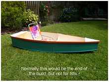 Another bit of time off then the kids were grown and I started back building boats, again. I built a 13' stitch-n-glue canoe and still have it hanging in the garage. I saw some plans on the internet and built a 8' Flats Rat (like a pram) that is still hanging in the garage as well!
