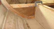 Simplicity was required to hide my lack of skills. I moved the centreboard back to sit exactly between the frames. This photograph also shows how I strengthened the 6 mm plywood, by cutting to size and gluing an additional layer of plywood for the first 3 planks from the bottom. The extra layer of plywood can be seen butting against the frame.