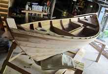 Initially, it would have been easy to lose heart, but when I discovered that the plans are available from Mystic Seaport Museum my fate was sealed. I ordered the plan and the table of offsets and then, after noticing a similarity between this boat and a lapstrake canoe, I ordered a book by David L Nichols (available on the Duckworks site) called Lapstrake Canoes. I bought several other books, but the technique I finally selected was a slight modification of David’s simple set of instructions. Of course everything had to be much bigger to fit the dory, but the steps remained the same. Before each stage I studied and understood the chapter in David’s book, then I adapted it to the dory and finally I did the work with the book at my side.