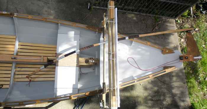 The final structural components are the floorboards, which rest on pine blocks that are glued and screwed to the bottom and bulkheads. The weight of passengers and crew is borne by the bulkheads rather than by the plywood bottom.